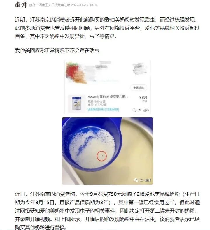 开罐见活虫,爱他美奶粉为何屡被曝“长虫”