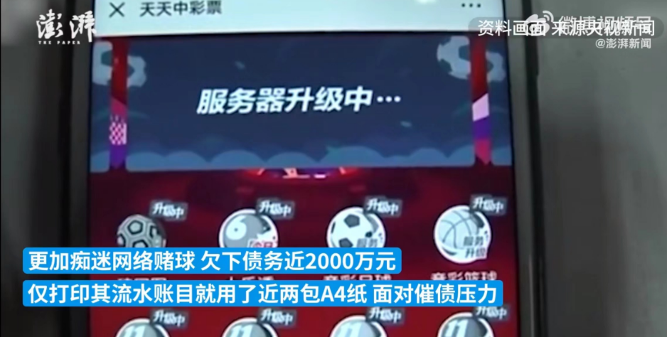 今年11月24日,中纪委发布文章《莫让赌球毁了年轻干部》,90后干部钟垚桢,在一次次赌球中欠下近2000万债务,光打印流水账,就用了两包A4纸。