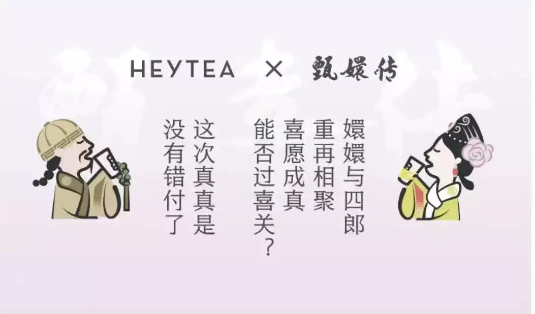 另一种营销方式也让品牌方尝尽了甜头,近期流行的奶茶与大热影视剧联名一时间供不应求。喜茶与《梦华录》联名,奶盖上被写上“顾”字,似乎喝了这杯奶茶,就成为了男主角的人;没过多久,尝到甜头的喜茶又推出了与《甄嬛传》的联名,奶茶也命名为“甄奶·雪酿含翠、甄果·大橘画梨”,还送各种限定纸袋、联名杯套、弹簧摇摇乐,以及换装贴纸。