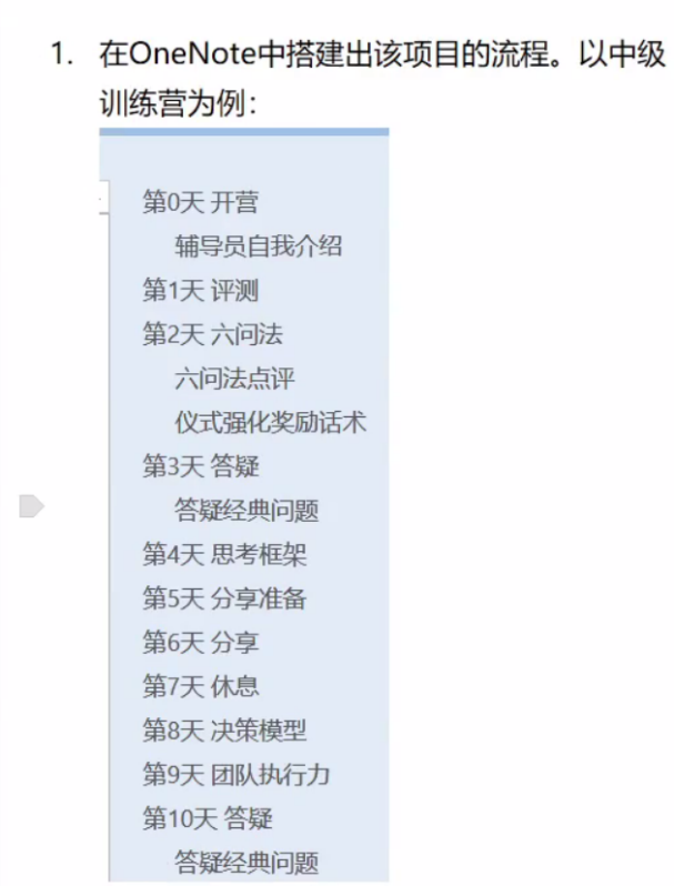 所以,我就想了个办法,首先按照时间顺序在OneNote里面把流程框架搭出来,再把每一天的详细执行过程放进去,梳理成一套工作流程框架(如下图)。