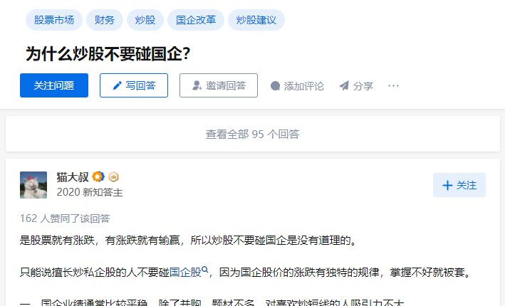 热门回复里,“国企业绩平稳、可炒作的题材不多”、“受政策影响较大”、“管理略显陈旧”等是频频出现的字眼。