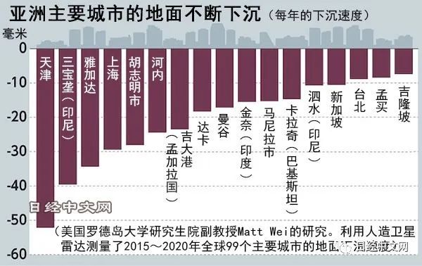 近年来亚洲各地发生大规模洪涝灾害并非偶然。美国罗德岛大学(University of Rhode Island)研究生院的研究团队使用人造卫星测量了2015~2020年全球99个城市的地面下沉速度,结果显示在排名前20位的城市中,有17个位于亚洲。下沉速度最快的是天津,每年达到52毫米以上,雅加达(34毫米)、曼谷(17毫米)等东南亚主要城市也排在十分靠前的位置。