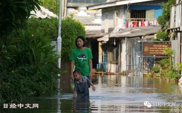 10月上旬,纵贯泰国南北的大河湄南河泛滥,首都曼谷近郊的寺院和住宅浸泡在水中。有些地区的洪水达到了成人的齐腰位置,当地居民说:“洪水高度是往年的2~3倍”。