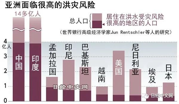 越是政局不稳的低收入国家,在水灾面前越是脆弱。世界银行首席经济学家等6月发布的报告显示,世界上面临水灾风险的人数超过18亿,其中大约12.4亿(占7成)集中在南亚和东亚。