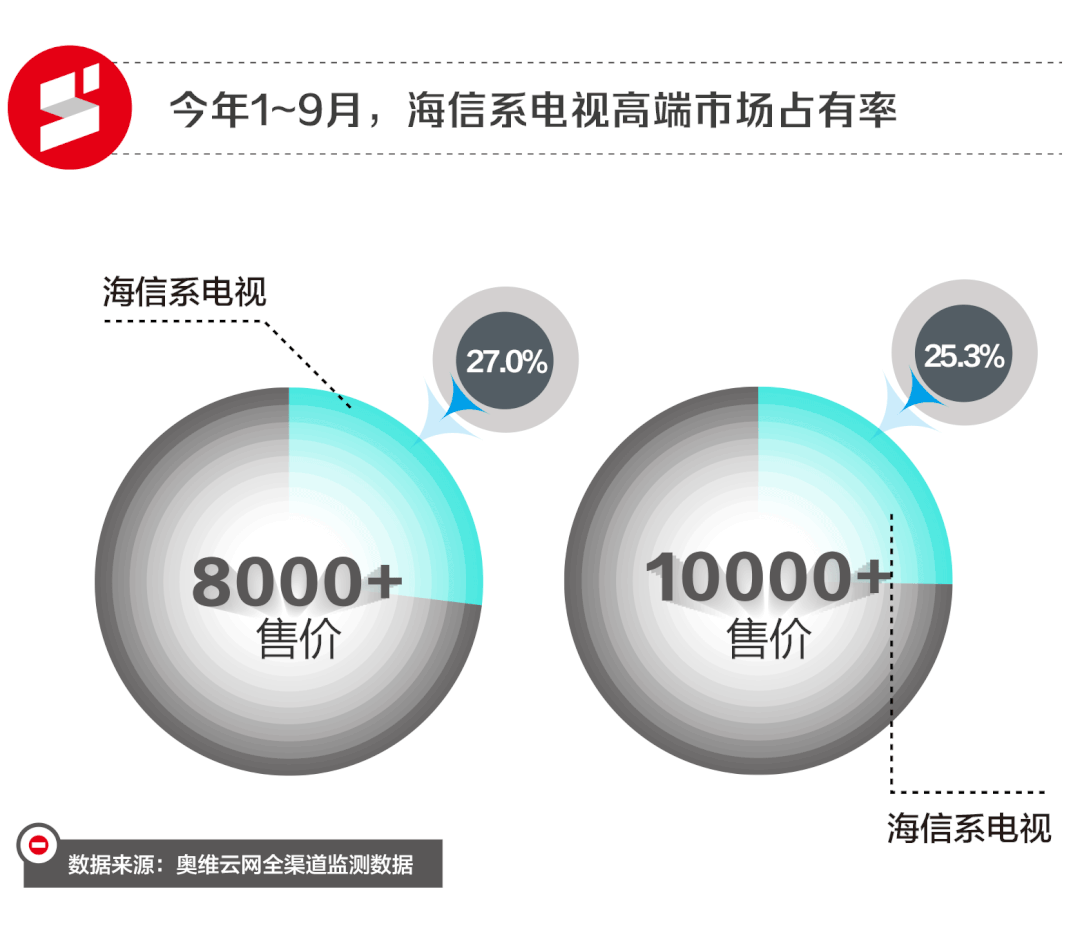 此外,得益于对激光电视等中高端产品的研发,海信也的确走在前面。奥维云网全渠道监测数据显示,今年1-9月,海信系电视在售价8000+和10000+两个高端市场的销售量占有率分别为27.0%和25.3%,均居于行业首位。