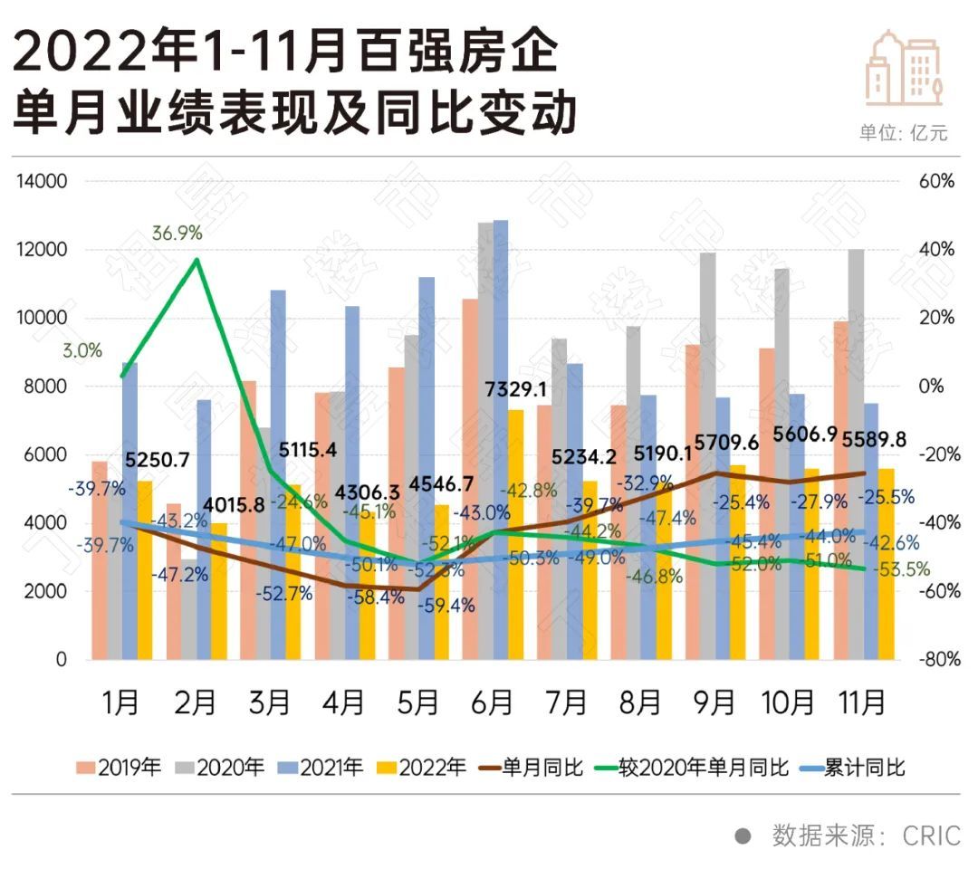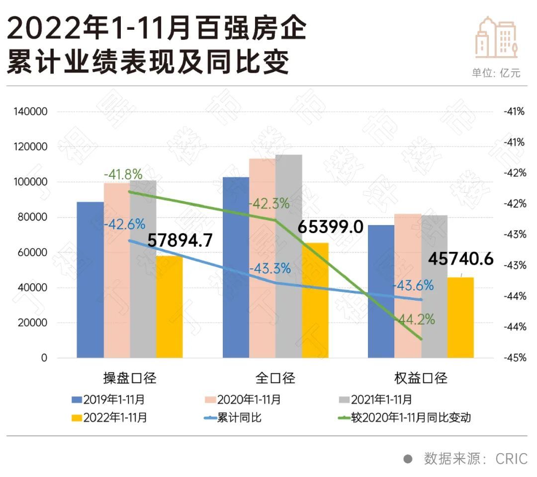 累计业绩来看,百强房企1-11月销售操盘金额的同比降幅仍保持在42.6%的较高水平。
