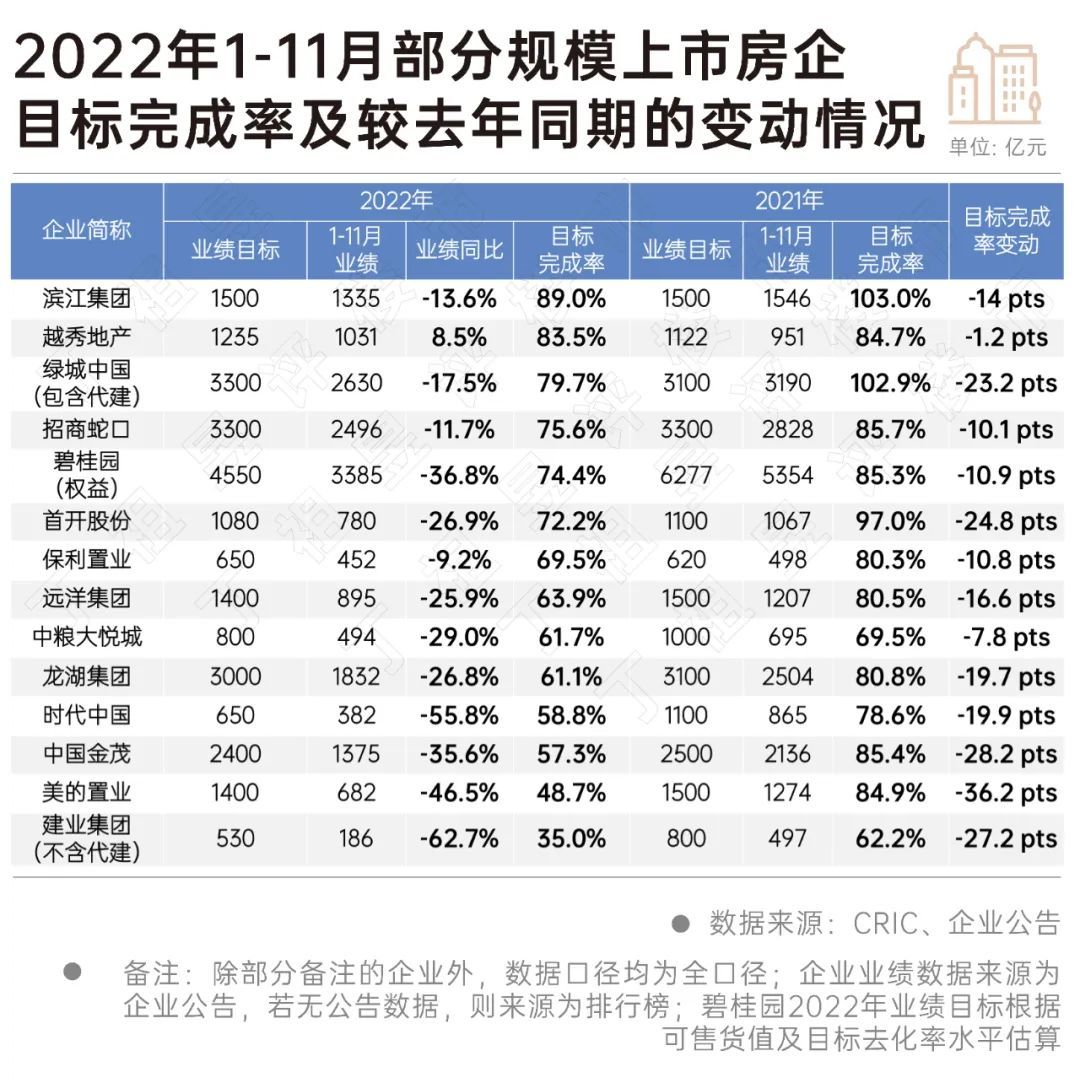 今年以来即使大部分房企选择不公开披露目标,或是主动调降全年目标。但从规模房企1-11月的业绩表现来看,企业整体的目标完成情况明显不及预期。