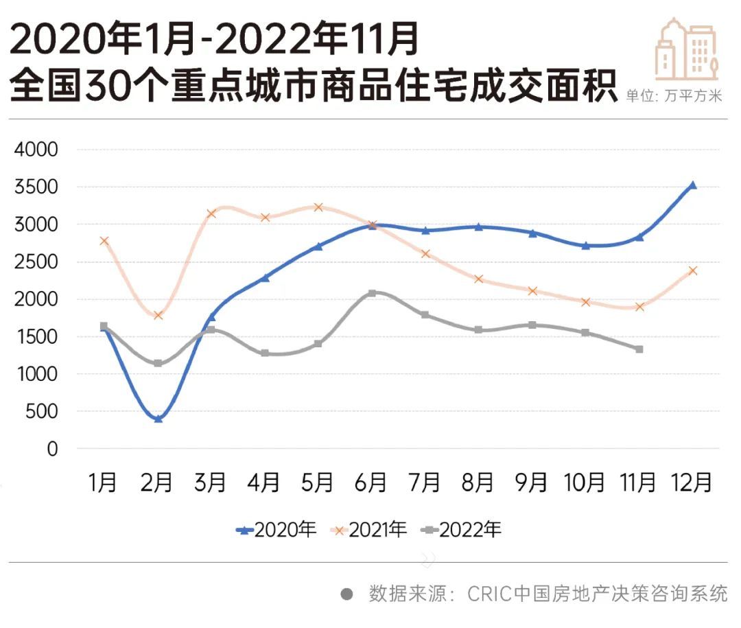 2022年11月,房地产市场整体继续探底,重点30城成交面积环比下降14%,创下半年来单月新低,同比跌幅扩至30%。