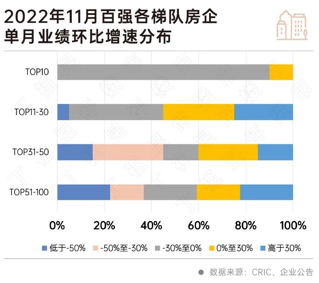 具体从企业表现来看,2022年11月百强房企中有近4成企业单月业绩环比增长,其中21家企业的环比增幅在0%至30%之间,19家企业环比增幅超过30%。