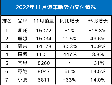 新造车11月剧变:哪吒险胜,蔚理进前三,小鹏继续腰斩