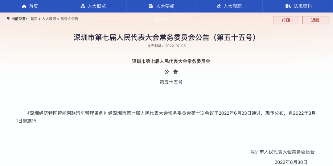 一直以来,深圳都是国内政策试行的先锋城市,就在今年6月,深圳刚刚宣布,《深圳经济特区智能网联汽车管理条例》(下称"《条例》")获市七届人大常委会第十次会议表决通过,并自2022年8月1日起施行。