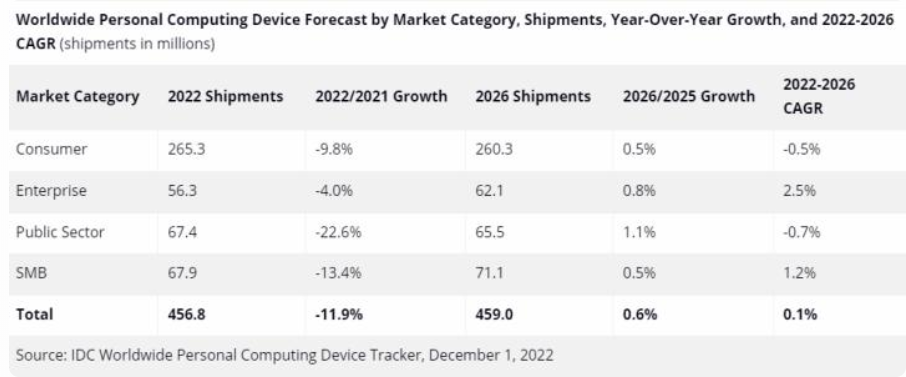 IDC最新数据显示,2022年全球PC和平板电脑出货量将下跌11.9%至4.57亿台,到2023年还将再此基础上继续下跌。报告指出,未来5年PC市场年均复合增长率约为1%,需求要到2025-2026年才有望改善。目前,全球供应商都面临库存过剩和周转率下降的影响,PC寒冬还要延续很长一段时间。
