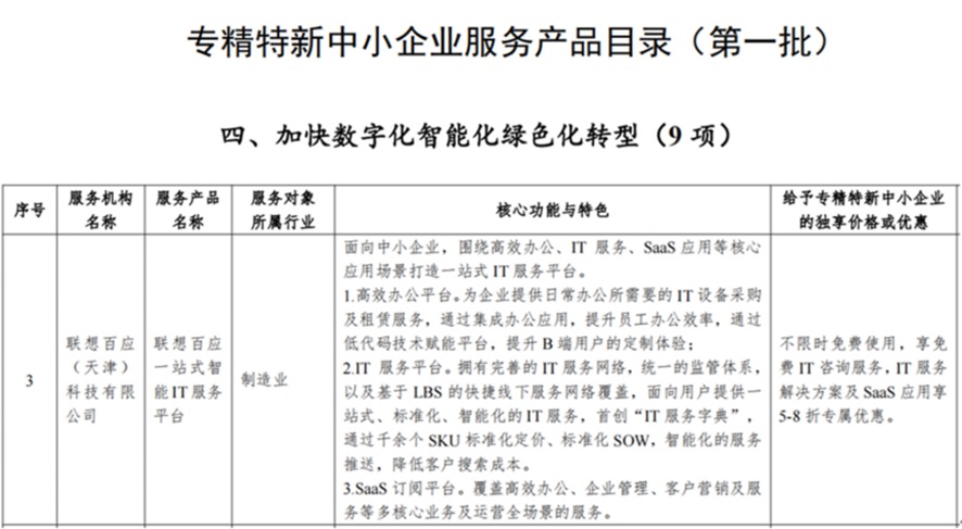 联想百应作为中小企业一站式IT服务及解决方案提供商,成功入选《专精特新中小企业服务产品目录(第一批)》,成为助力中小企业加快数字化智能化绿色化转型的平台型服务产品之一。