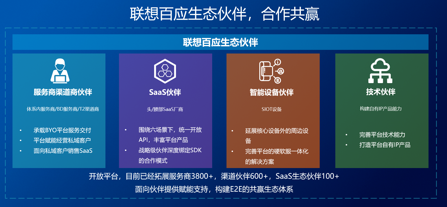 在服务生态化模式下,联想百应平台融合了智能设备生态、SaaS生态合作、技术生态、服务商生态、渠道商生态等五种生态伙伴,强调的是合作共赢。很多中小企业既是联想的客户,又是联想的合作伙伴,联想通过把各家的产品进行相应的整合,最后能够做到为企业实现端到端的解决方案,大家一起来获益,实现共赢。