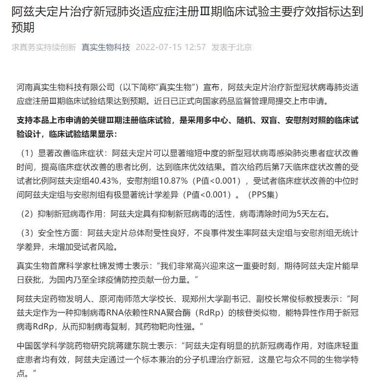 2020年4月,阿兹夫定获得国家药品监督管理局治疗新型冠状病毒肺炎Ⅲ期临床批件,开始在我国进行Ⅲ期临床试验。这也是阿兹夫定增加新冠肺炎治疗适应症申请的关键试验,真实生物于2022年7月15日在官方微信公众号上曾发布相关的“主要疗效指标达到预期”的消息。