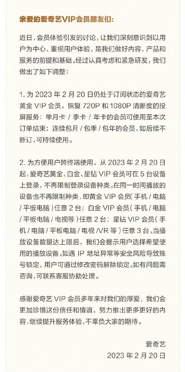 而在2月20日,爱奇艺发布关于会员服务优化情况说明,明确黄金VIP会员恢复720P和1080P清晰度投屏服务。