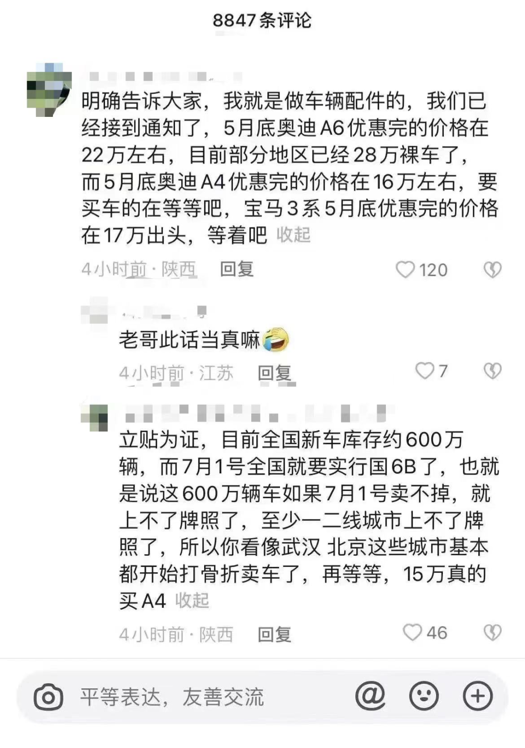 有网友在评论区说天塌了,已经接到通知:5月底奥迪A6亿优惠完裸车22万,现在部分地方已经出现28万的裸车了。