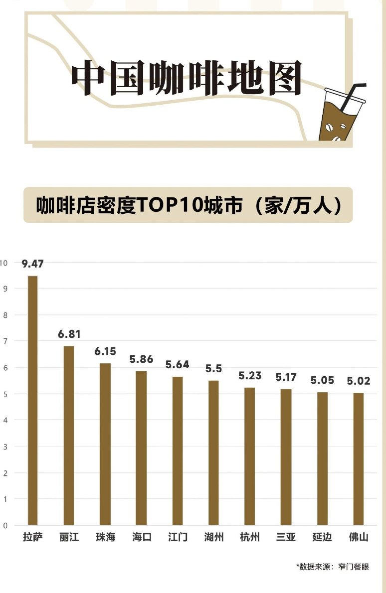 窄门餐眼数据显示,截至2025年10月,全国咖啡门店总数已达254730家。广东、浙江、江苏三大沿海省份位居前三,门店数量分别为41959家、22496家和19729家。上海是唯一咖啡门店数突破万店的城市,以10652家位居榜首;广州、北京分别以8452家和7335家位列第二、第三名。不过,咖啡浓度最高的城市却不是上海。数据显示,拉萨虽只有830家咖啡门店,但对应约87万常住人口,咖啡浓度全国排名第一。>>>点击查看详情