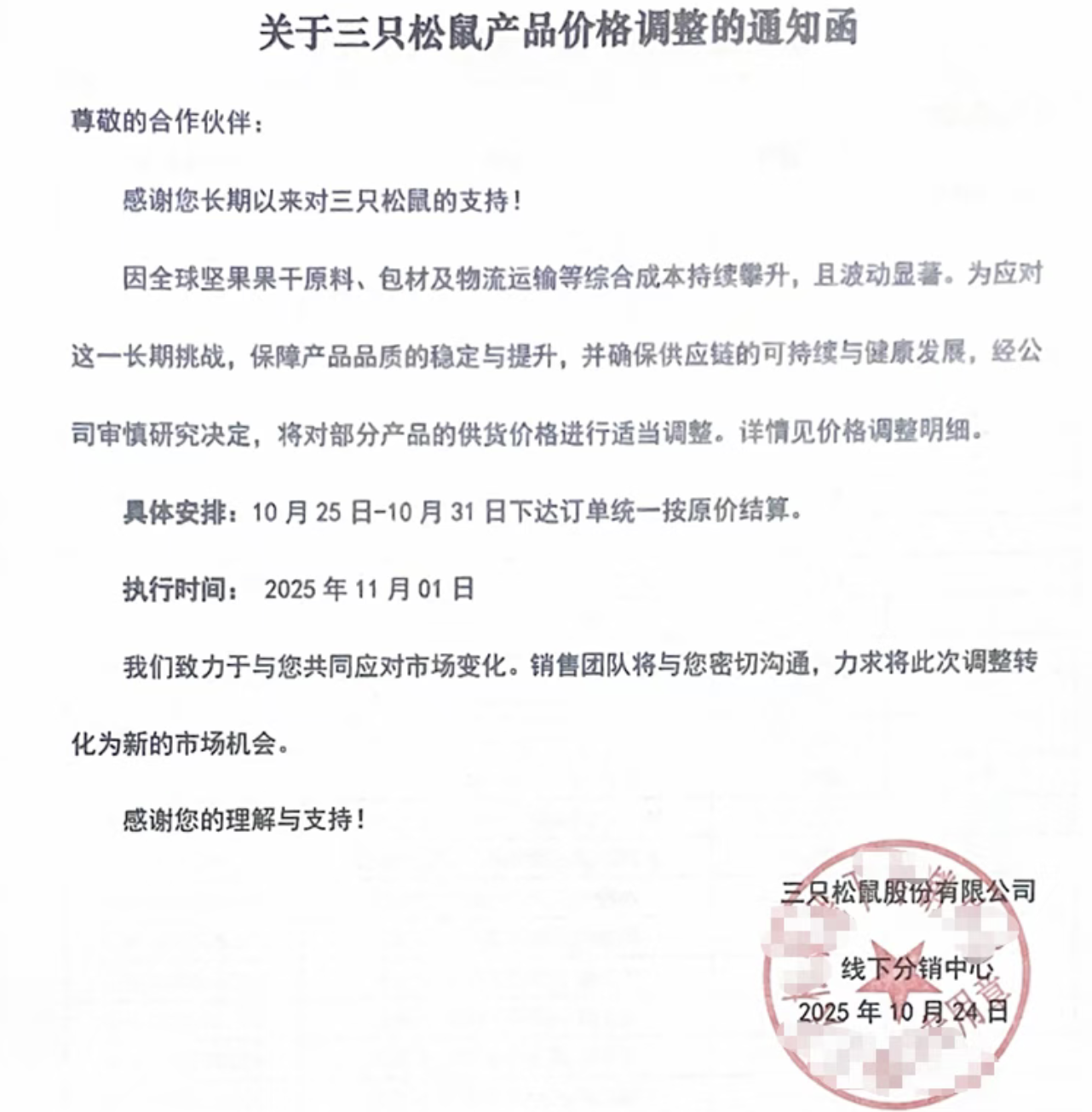 三只松鼠面向经销商发布通知称,因全球坚果果干原料、包材及物流运输等综合成本持续攀升且波动显著。为应对这一长期挑战,保障产品品质的稳定与提升,确保供应链的可持续与健康发展,三只松鼠经审慎研究作出调价决定。自11月1日起对35款产品调整供货价格,涉及开心果、巴旦木、芒果干、瓜子以及坚果等热门产品。在10月25日至10月31日期间下单的订单仍按原价结算,以给予合作伙伴一定的缓冲期。