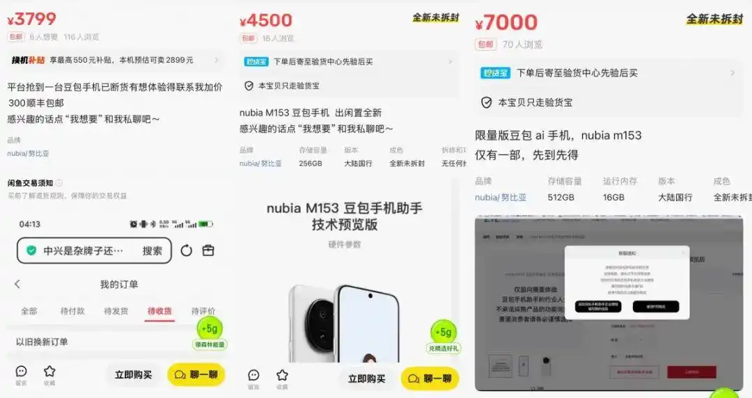 近日,搭载豆包手机助手技术预览版的工程样机努比亚M153少量发售。该机型主要面向开发者和科技爱好者,售价3499元。目前,该机型已在中兴商城售罄。二手平台上,有用户称“在官网抢到一台‘豆包’手机,加价300可顺丰包邮”;也有人以高达7000元的价格转让,溢价3500元,目前有70人浏览。其他二手努比亚M153溢价后的价格大部分在4000元到4500元之间。