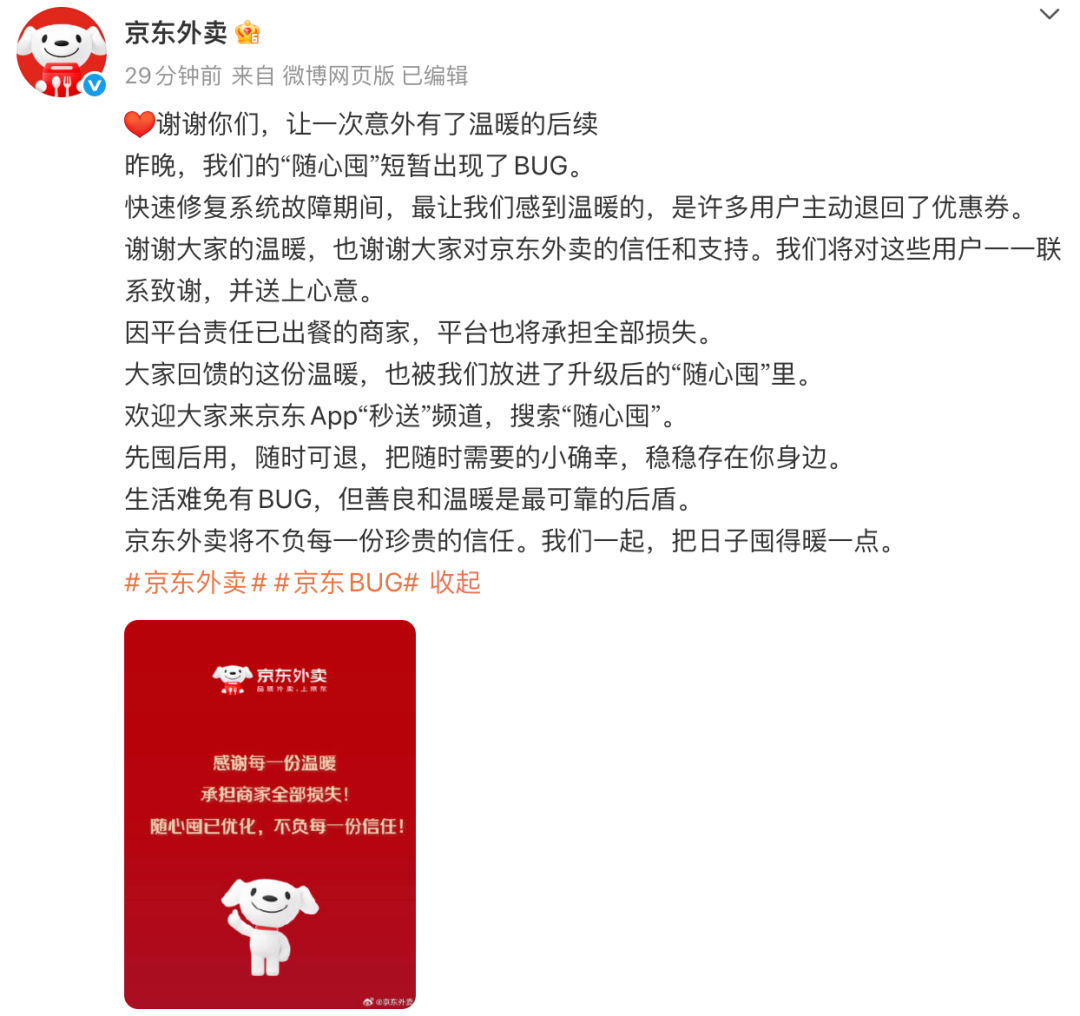 日前,京东外卖“随心囤”功能出现BUG。多名网友反馈称,购买京东外卖100张券后申请全额退款,平台只收回1张券,剩余99张还在用户手里。为此,有网友连续下了上百单外卖。对此,京东外卖回应表示:因平台责任已出餐的商家,平台将承担全部损失。据了解,本次出现BUG的“随心囤”主要针对高频日常商品开展灵活促销,购买后券可抵扣指定商家的对应商品金额。特点是先囤券后使用,可以随时退、部分退、过期自动退。