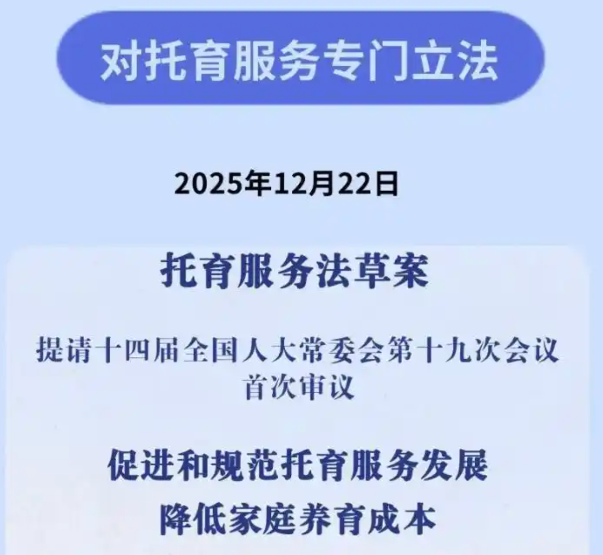 12月22日,托育服务法草案提请十四届全国人大常委会第十九次会议首次审议。草案共8章76条,包括总则、托育机构、托育人员、服务提供、保障措施、监督管理、法律责任和附则。制定托育服务法,促进和规范托育服务发展,为三周岁以下最柔弱的婴幼儿群体提供坚实的法治保障,是完善生育支持政策、降低家庭养育成本、提高人口素质的重要举措,对建设生育友好型社会,推动人口高质量发展,具有十分重要的意义。