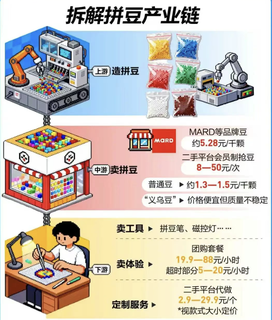 随着《疯狂动物城2》狂砍36亿元票房,一股拼豆手工热潮席卷社交网络。在淘宝、拼多多等平台,爆款拼豆材料包月销量轻松破万,热门IP款式一度售出超60万件。在线下,这股热潮也已转化为了实实在在的商业价值。在大众点评上搜索“拼豆”,多数手作店已上线相关体验项目,价格从每小时19.9元到88元不等,销量普遍破千。其中,一家手作馆标价84.9元/小时的拼豆套餐年售超5000份,仅此单项年营收就达42.5万元,月均超3.5万元。