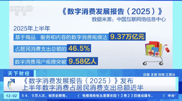 中国互联网络信息中心发布的《数字消费发展报告(2025)》显示,2025年上半年,基于商品、服务和内容的数字消费规模达9.37万亿元,占居民消费支出总额的46.5%。数字消费用户规模突破9.58亿人。数字商圈、智慧街区带货等新业态,正在为消费市场注入新动能。 数字消费用户既重视基础类商品性价比,也乐于为品质和情绪付费。1.64亿用户通过电商平台参与“以旧换新”,1.43亿用户在网上进行二手消费,闲置经济规模突破万亿元。