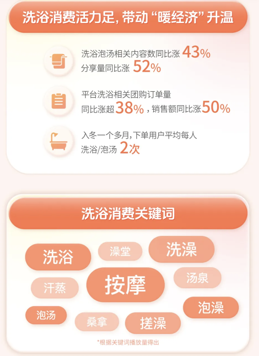 抖音生活服务发布的《洗浴消费报告》显示,天气转冷,洗浴、汗蒸和泡汤等关键词在抖音的搜索量明显上涨,11月1日至12月10日,抖音平台洗浴泡汤相关内容数同比涨43%,分享量同比涨52%。平台相关团购订单量同比增长超38%,销售额同比涨50%。11月至今,下单用户平均每人洗浴或泡汤2次。 洗浴泡汤呈现出“北搓澡、南汤泉”特性。“洗浴+餐饮”“洗浴+住宿”“洗浴+电竞”等的“洗浴+”团购组合越来越多样,带动多业态爆发。>>>点击查看详情