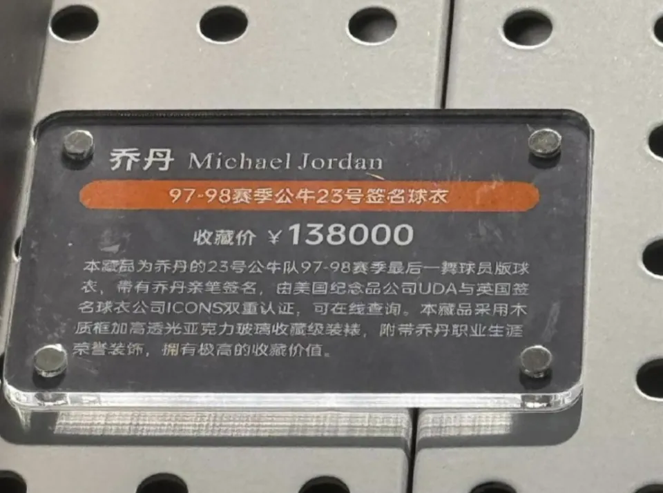 近日,河南省新乡市胖东来超市开始试营业,吸引众多顾客光顾,除正常商品外,有网友发现该店三楼设置了一个专柜,陈列着梅西、姆巴佩、库里、乔丹等足篮球星的签名球衣,价格从数千元到数万元不等。其中,最贵的当数乔丹1997—1998赛季公牛23号签名球衣,售价为138000元。胖东来客服介绍称,这些签名球衣来源清晰,商品保真。试营业首日,已经售出一件。至于后续是否会补货以及增加其他球星球衣则暂不确定。