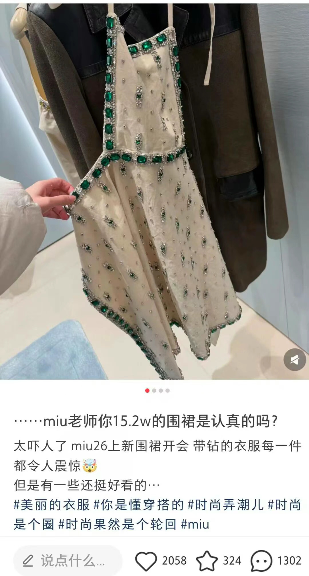 日前,有网友在社交平台发帖称,在一家商场看到Miu miu的满钻“围裙”,一条售价高达15.2万元,引发网友热议。有媒体评价,这是一种“将家务服装带上秀场的挑衅”;也有网友称,“去村里赶大集也能买到”。该款围裙式连衣裙属于Miu miu2026春夏系列。争议成为了Miu miu的免费广告,最终实现了“越骂越火”的效果。数据显示,这款围裙式连衣裙亚洲预售量逆势上涨35%。