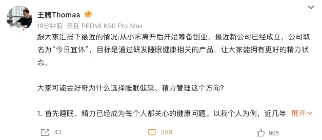 在去年9月因违规被小米辞退后,王腾的去向一度成谜,直到近日他正式官宣——新公司“今日宜休”已上线,主攻睡眠健康赛道。昔日的数码圈爆料大王,要帮大家睡个好觉了!王腾坦言,自己在小米工作强度常年拉满,睡眠不好第二天就浑身疲惫,离职那段时间压力爆棚,更是深刻体会到睡眠焦虑的滋味。和朋友一聊才发现,这不是他一个人的困扰,这也让他下定决心,从“卷性能、卷加班”转向“卷睡眠、卷休息”,用另一种方式和过往的大厂节奏和解。