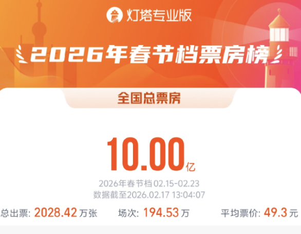 大麦娱乐旗下灯塔专业版数据显示,截至目前,2026春节档(2月15日-2月23日)档期总票房(含预售)已突破10亿元。票价方面,今年春节档平均票价49.3元,比去年的票价低超一元,与2024年春节档票价持平。更为重要的是,今年AI全面进入了观影环节。千问发布的数据显示,过去两天,用户通过AI在大麦买电影票的订单环比增长372倍,其中来自三四线城市的AI订单量暴涨782倍。