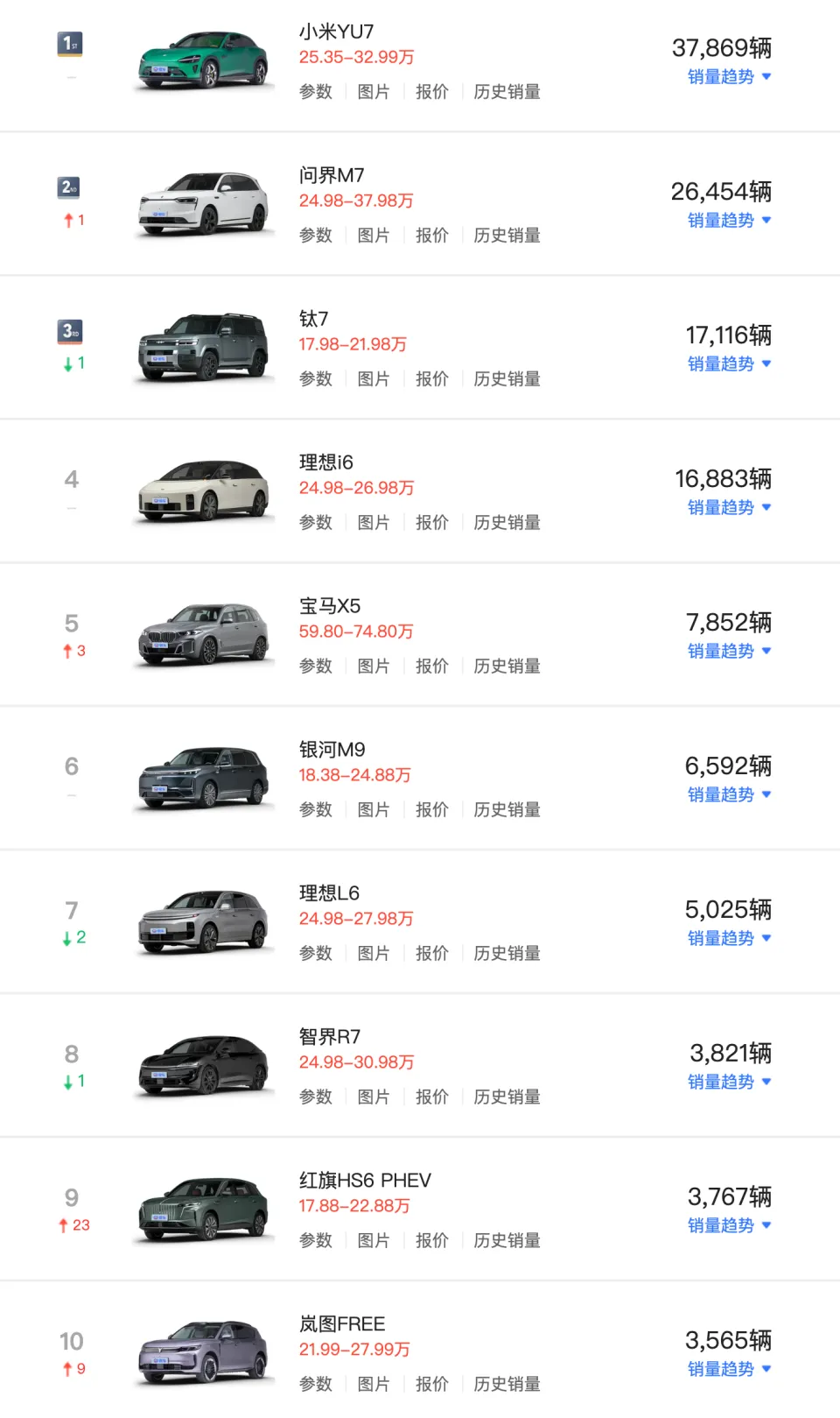 2026年1月中大型SUV销量榜出炉!根据乘联分会公布的数据,1月自主品牌共有9款车型上榜,且均为电动车,仅宝马X5一款外资品牌车型上榜。其中,小米YU7以37869辆位居榜首,是唯一一款超过3万辆的车型,其也是2026年1月最畅销的车型。事实上,小米YU7已经连续5个月为纯电中大型SUV销量冠军。近几年,最畅销的车型要么是微型车宏光MINIEV,要么是小型车吉利星愿,要么是燃油车日产轩逸,唯一能与小米YU7不相上下的是特斯拉Model Y。
