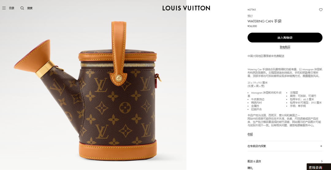 近日,LV一款名为“Watering Can”(译为洒水壶)的手袋在网络走红。在LV官网上,Watering Can手袋售价为36000元,小配饰售价为7750元。至于设计灵感,LV官方客服表示:浇花水桶造型、小喷水壶造型等灵感都来源于春季万物复苏,寓意花园、花朵孕育新的生命。这款包不是面向大众的常规款式,数量比较少,有特定的受众人群,此前设计师也做过一些异形包,如“龙虾包”“土司包”等。