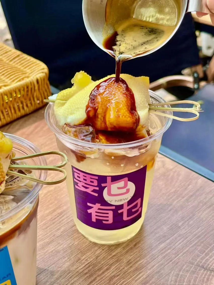 最近,白切鸡又一次“出圈”。不过这次,不是出现在粤菜馆或烧腊档口,而是登上了咖啡店的菜单。在某网红咖啡店,顾客购买任意一款饮品,加5元就能拥有一只“白切鸡”。不过这只“靓鸡”并非真鸡肉,而是由玉米味奶冻制成,口感微甜。奶冻表面压印出清晰的鸡皮纹路,竹签一串,架在咖啡杯口上,就成了一只微缩版的“白切鸡”。这款“自带流量”的新品,很快让这家小店“一鸡难求”。大量消费者排队购买,“白切鸡”通常上午十点半左右便会售罄。