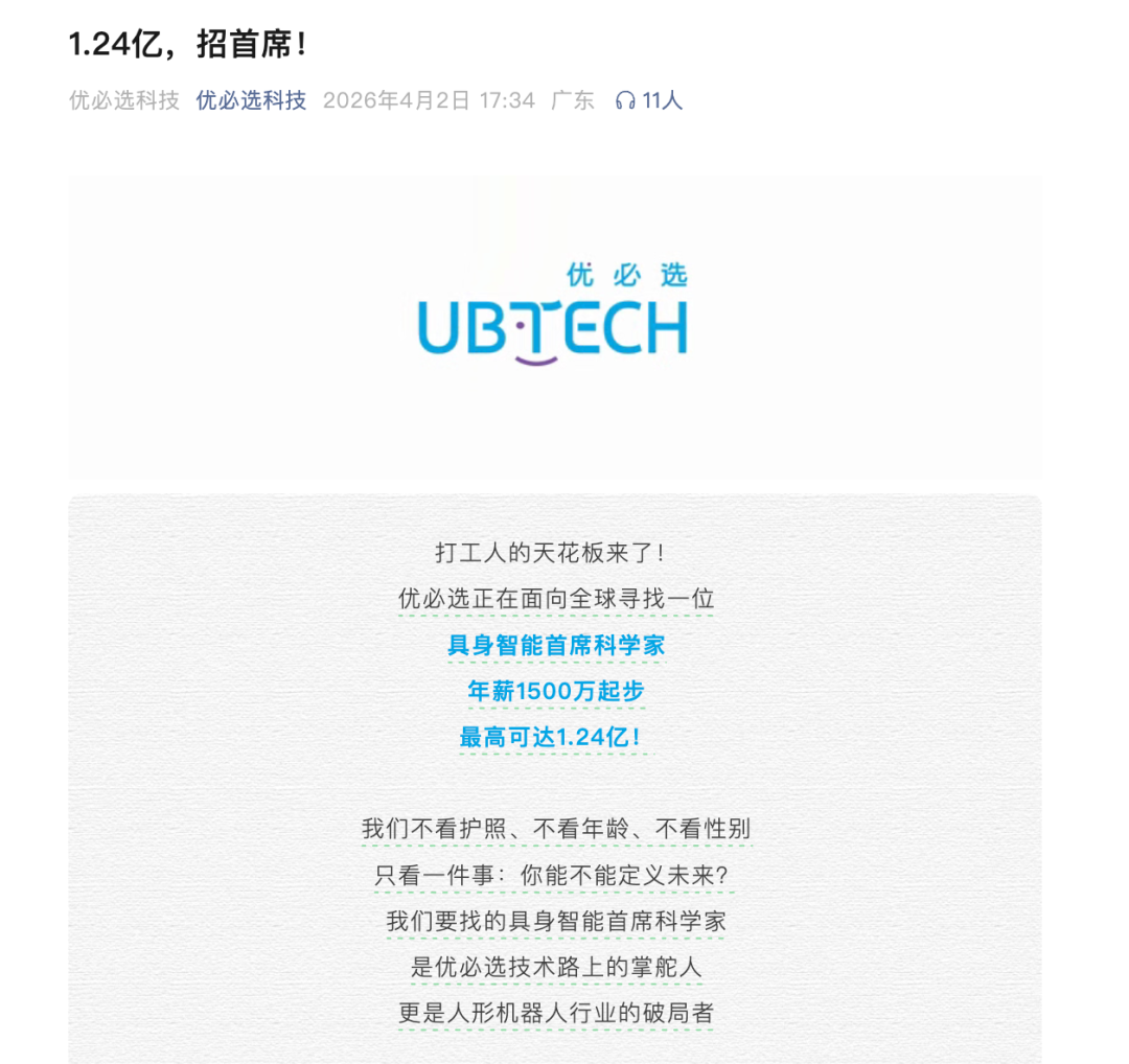 4月2日,优必选科技发布消息称,公司正面向全球招募具身智能首席科学家,年薪1500万元起步,最高可达1.24亿元。值得注意的是,这一薪资远超特斯拉、波士顿动力、腾讯、小米等公司同级别岗位的薪资,为目前全球机器人与AI领域公开招聘的最高薪资水平,优必选科技也在招聘公告中直言其为“打工人的天花板”。公开资料显示,优必选科技成立于2012年3月,公司主要布局人形机器人全栈式技术。2023年12月,优必选在香港交易所主板挂牌上市,成为“人形机器人第一股”。