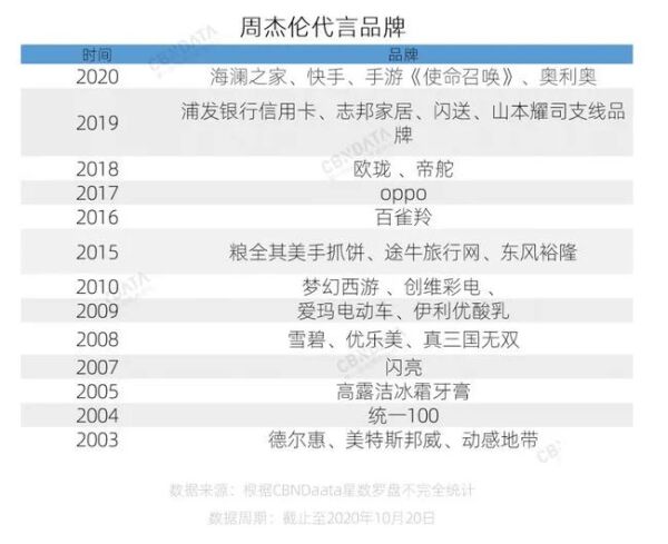 而周杰伦恰好是出圈方面的佼佼者。据不完全统计,加上今年的快手、《使命召唤》手游,出道20年以来周杰伦至少拥有28个品牌代言人身份,这些代言中优乐美、美特斯邦威、爱玛电动车等平价品牌都因周杰伦打响了名号。
