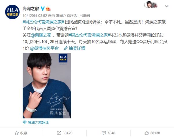 10月20日,海澜之家在微博官宣,喜提全新代言人周杰伦。