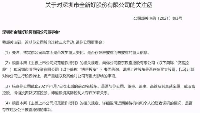值得一提的是,全新好的股价异常波动也引起了监管机构的关注,1月9日,深交所下发关注函,直问上市公司是否存在涉嫌内幕交易、是否存在股东买卖股票、转让股权等情形,关注函要求全新好核查股东与公司董监高及直系亲属的关系,并核实基本面变化情况。