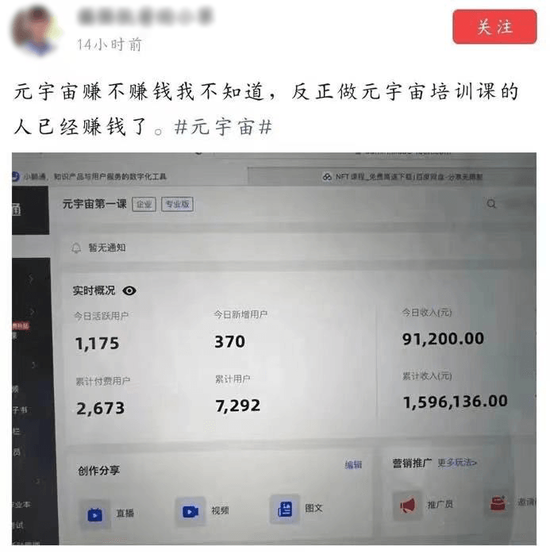 不久前,有网友在社交平台上晒出了“元宇宙第一课”的培训截图。从图上可以看出,该课程今日活跃用户1175,新增用户370人,累计付费用户2673,累计用户7292人。今日收入9.1万元,累计收入159.6万元。