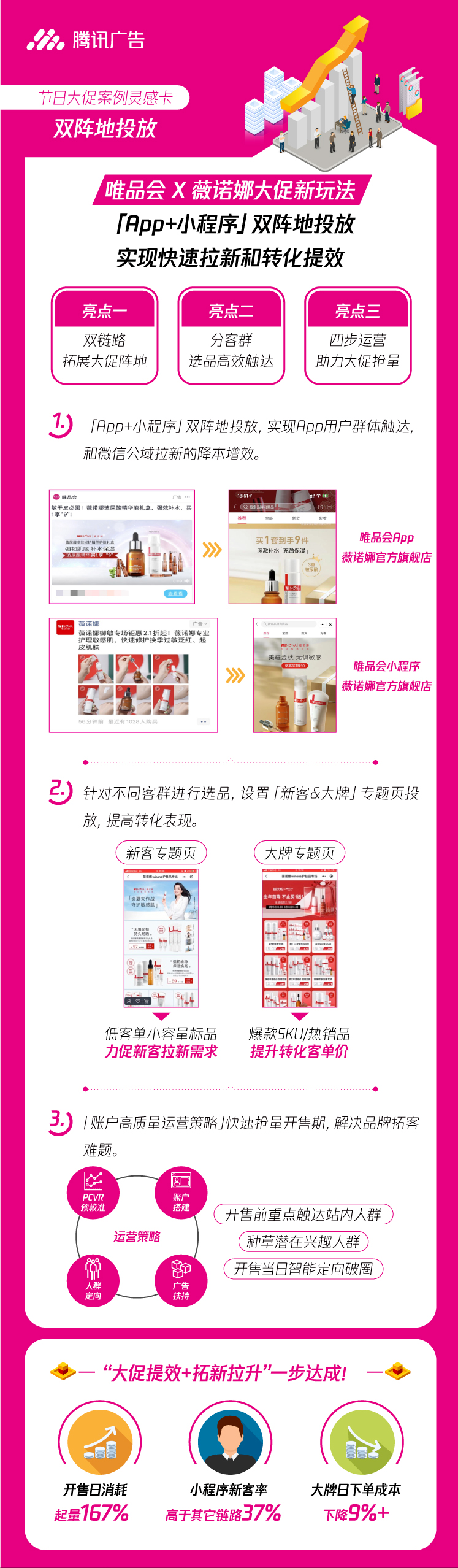以薇诺娜为例,将唯品会作为营销主阵地的薇诺娜,在大牌日期间选择利用App+小程序双链路进行广告投放。