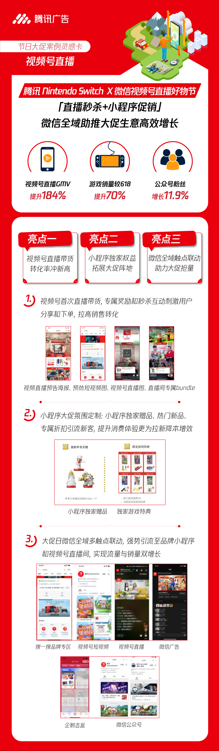 以腾讯NintendoSwitch为例,大促日期间,腾讯NintendoSwitch加入视频号直播好物节进行首次直播带货,联动微信全域多触点为视频号直播间引流,并以专属奖励和秒杀互动活动,刺激直播间用户分享、下单,从而提升销售转化。