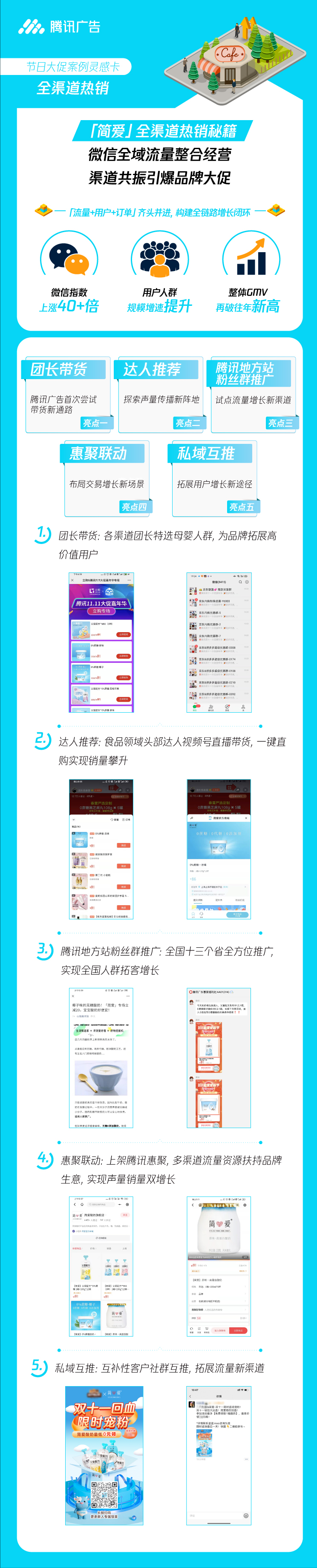 酸奶品牌简爱则在该玩法下,充分整合经营微信全域流量,全面打通腾讯惠聚、KOL生态达人渠道、腾讯自建私域渠道以及团长小B渠道,有效抢占流量洼地,并在团长带货、达人推荐、区域推广、惠聚联动以及私域互推等多种引流带货新方法的联合助力下,构建起全链路增长闭环,最终也成功实现流量、用户与订单的全盘增长。