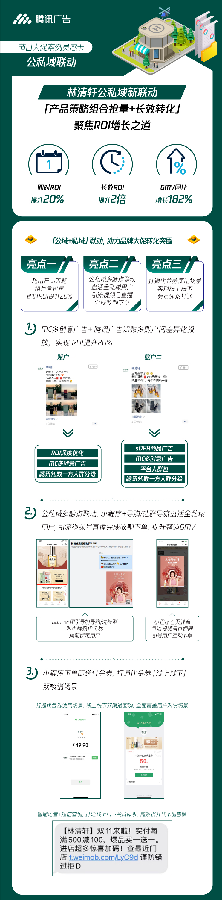 如林清轩在大促期间便以具有用户利益点的素材吸引用户关注,锁定目标人群,并通过小程序广告下单送代金券等丰富的后链路运营方法,多触点联动触达用户,刺激用户线上、线下双场景核销复购,从而提升整体GMV。数据显示,通过对该阵地的精细化运营,林清轩大促期间GMV同比增长182%。