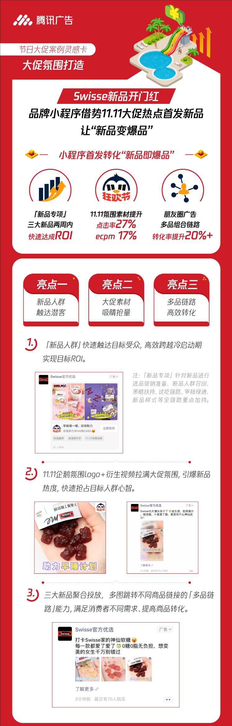 以知名营养品牌Swisse为例,Swisse借势11.11大促节日热点首发新品,通过腾讯广告提供的11.11企鹅氛围LOGO营造大促氛围,快速引爆新品热度,抢占目标消费者心智。