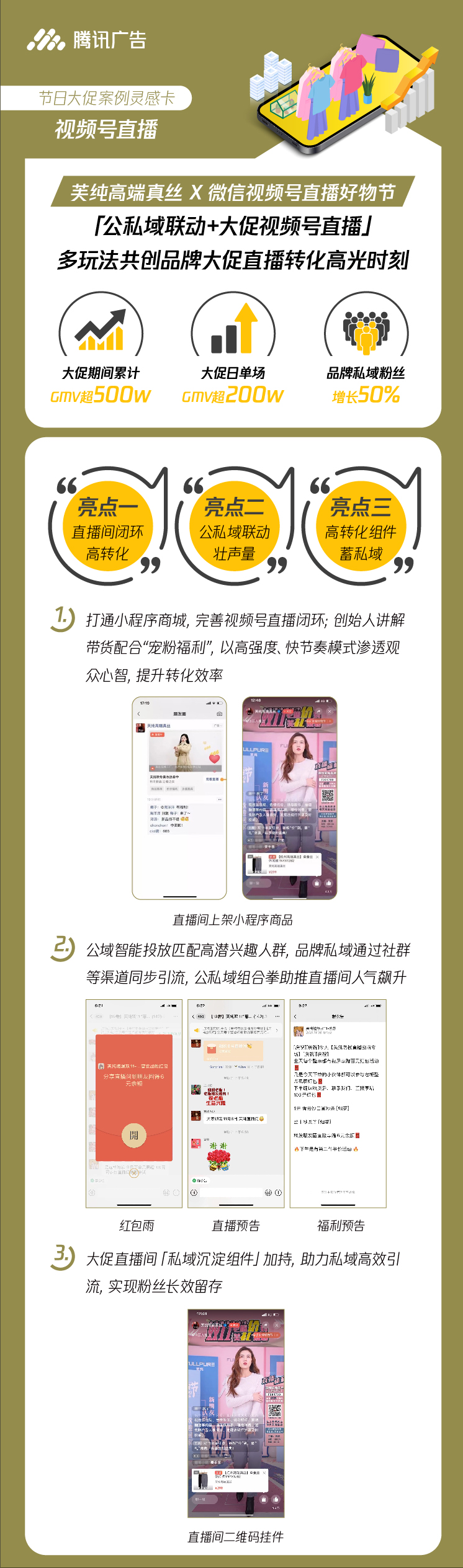 根据数据显示,视频号直播好物节期间,芙纯高端真丝视频号直播带货GMV超500万,私域粉丝增长50%,成功取得直播带货新突破。