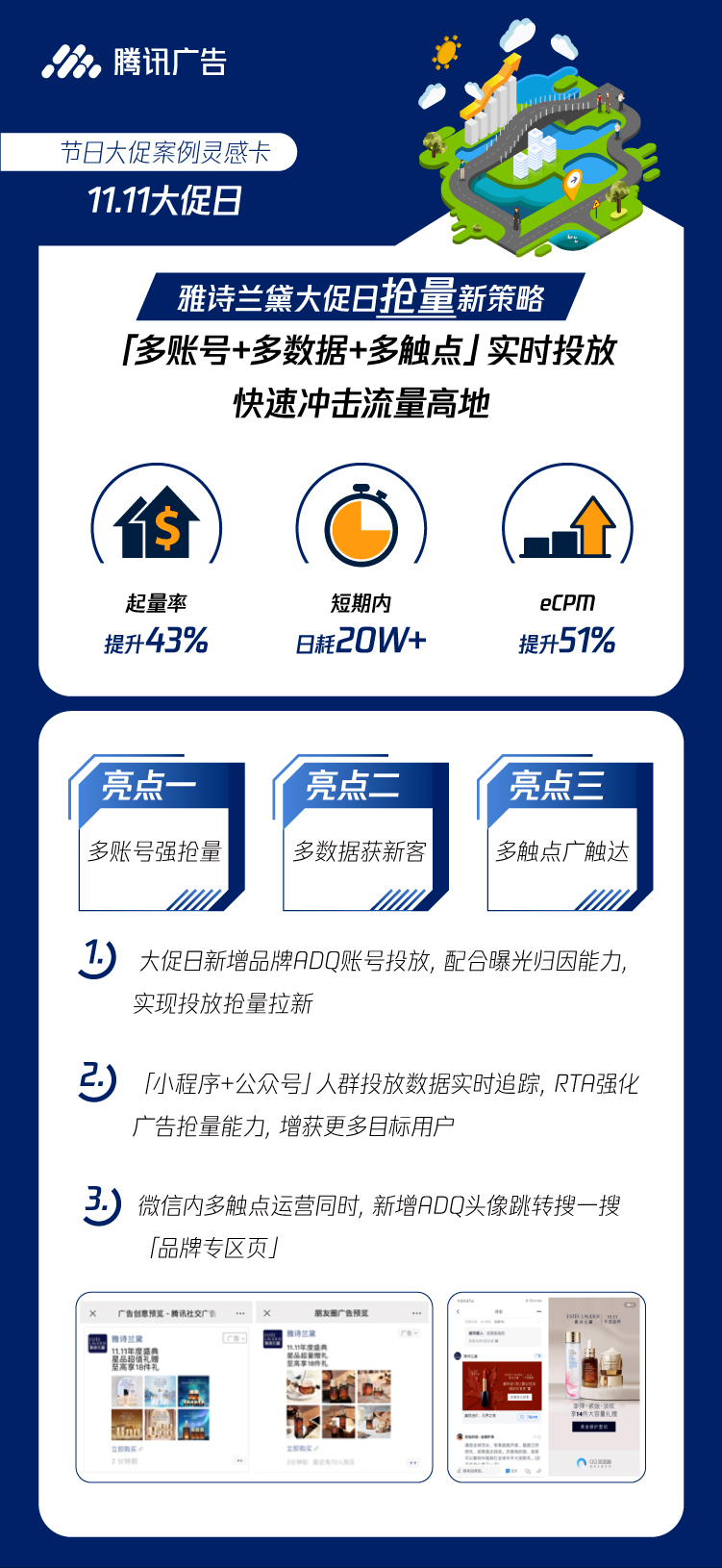 另外,早在微信生态内积累大量用户群体的雅诗兰黛也在大促期间针对小程序人群进行重点投放,并通过多账号、多数据、多触点的实时投放方式,强化对小程序、公众号人群的抢量能力,快速抢占流量高地,从而有效增获更多目标用户群体。根据数据显示,大促期间,雅诗兰黛起量率提升43%,eCPM提升51%。