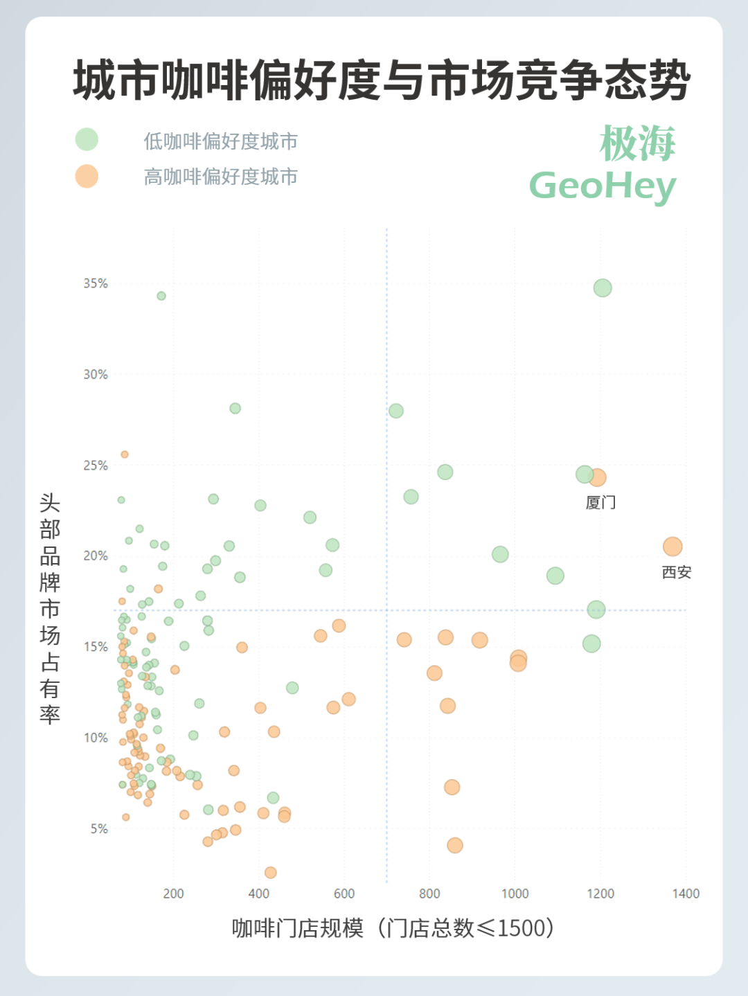 我们在探索的过程中发现一个有意思的结论,在下沉市场(咖啡门店规模在1500家以下),相同的品类规模下,比如都是500家咖啡店,咖啡偏好度低,也就是绿色的点代表的城市,头部品牌的市场占有率普遍要远高于咖啡偏好度高的城市,也就是图中红色的点代表的城市。