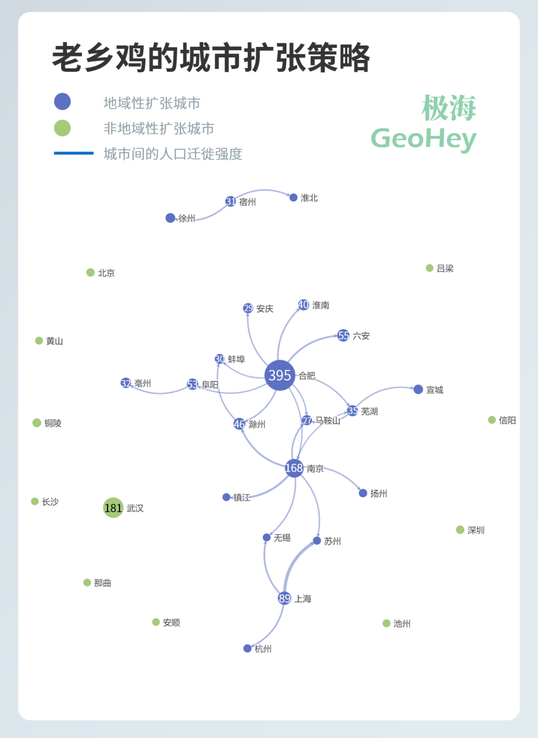 以老乡鸡为例,将城市之间的人口流动频繁的城市链接起来,老乡鸡的城市分布就像是一张紧密相连的大网。